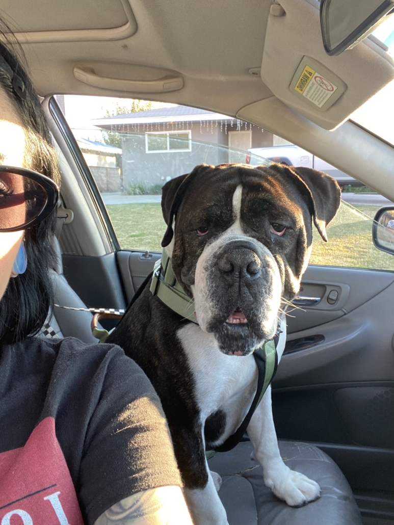 Although Biggs had come a long way, he still needed a very special adopter—someone who had lots of love in their heart for a dog who had been through so much. And that’s when Nadine happened to come across one of our TikToks of an adorable dog lying on his back in our training room and enjoying belly rubs. She knew she had to meet him… and the rest is history.
