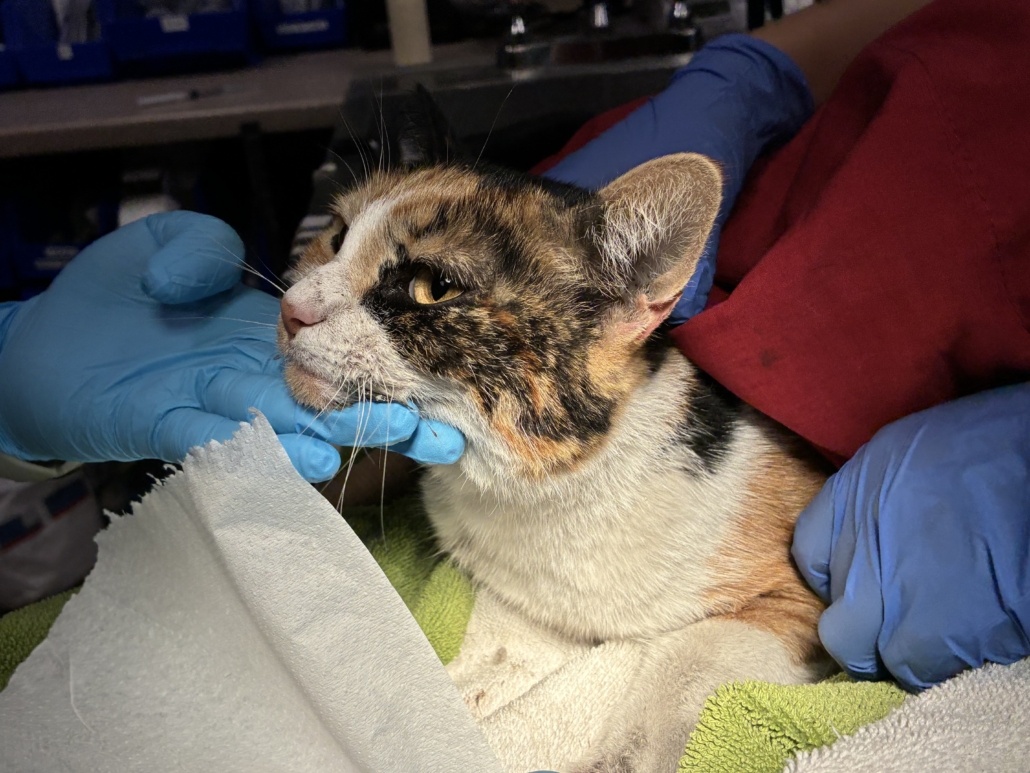 Our ACO immediately brought the cat to Pasadena Humane for emergency treatment in our ICU. She had severe hypothermia— and in fact, her body temperature was so low, the thermometer couldn’t even get a reading. She was also showing signs of dehydration. Our veterinary team wasted no time warming her up and giving her fluids. Although she was in rough shape, we were hopeful that she had gotten to us in time.