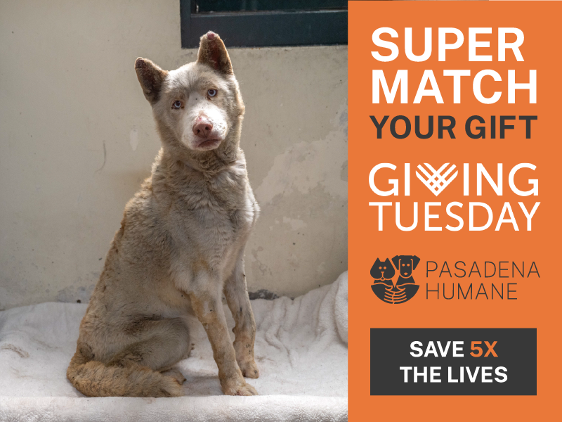 To support animals like Riley, Pasadena Humane is launching a 5x Giving Tuesday Super Match. Through midnight on December 2, every donation will be QUINTUPLED, up to $100,000, thanks to the Sterling Pile Trust.