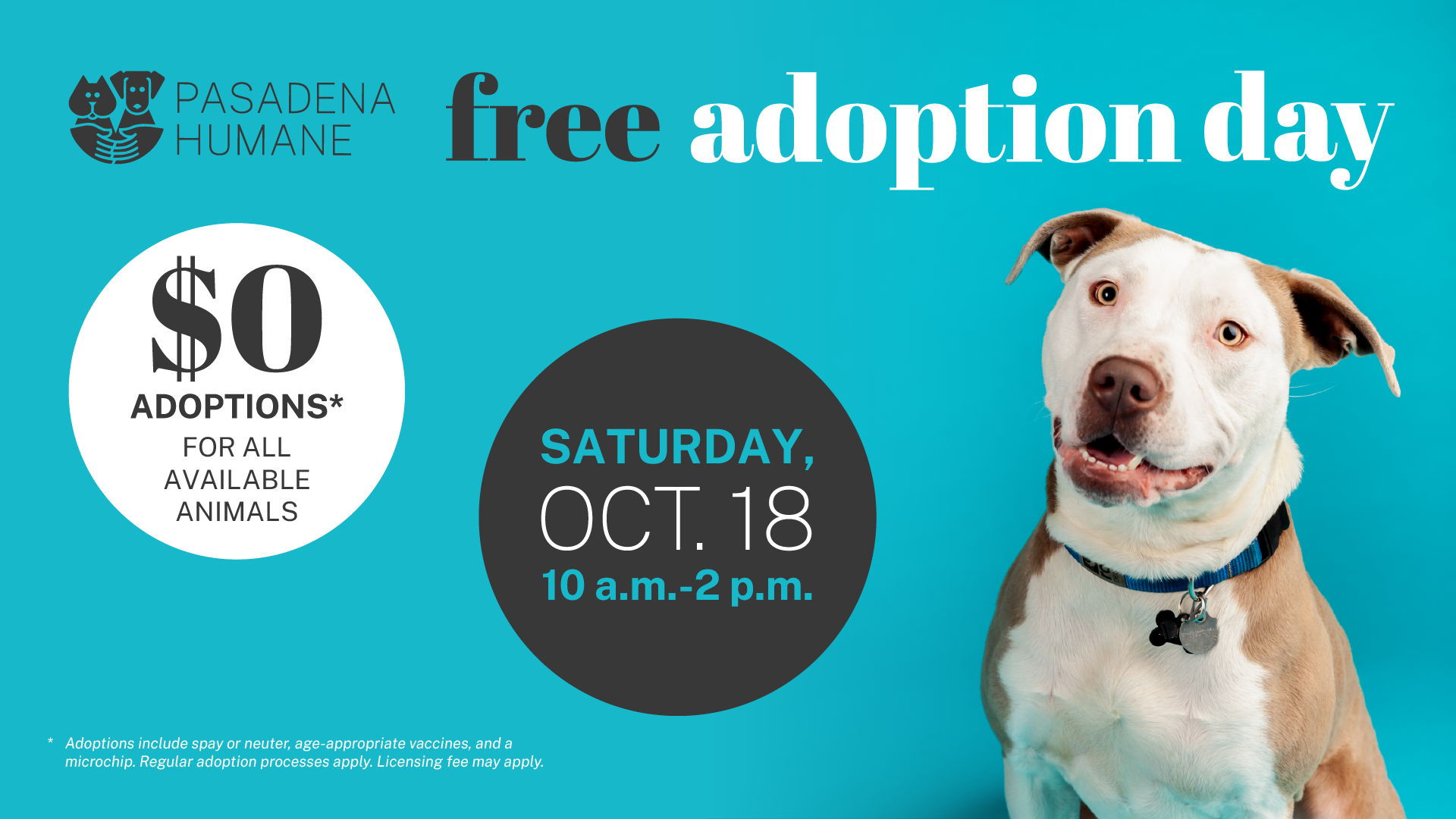 Join us at Pasadena Humane on Saturday, October 18 from 10 a.m. to 2 p.m. for Free Adoption Day! Adoption fees will be waived for all available dogs, cats, and critters. Adoptions include spay or neuter, age-appropriate vaccines, and a microchip. Regular adoption processes apply. Licensing fee may apply. Please leave your family pets at home.
