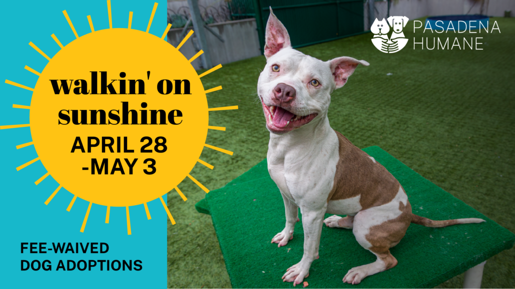 To celebrate this small but impactful shift, Pasadena Humane is waiving all dog adoption fees from April 28 – May 3 with a promotion entitled “Walkin’ On Sunshine”. Adoption hours will remain 10:00 a.m. – 5:00 p.m., with a slight twist. Each day the shelter will have “walk-in adoptions” from 1:00 p.m. – 5:00 p.m., during which potential adopters can stroll through the kennels to make a connection with their new best friend.